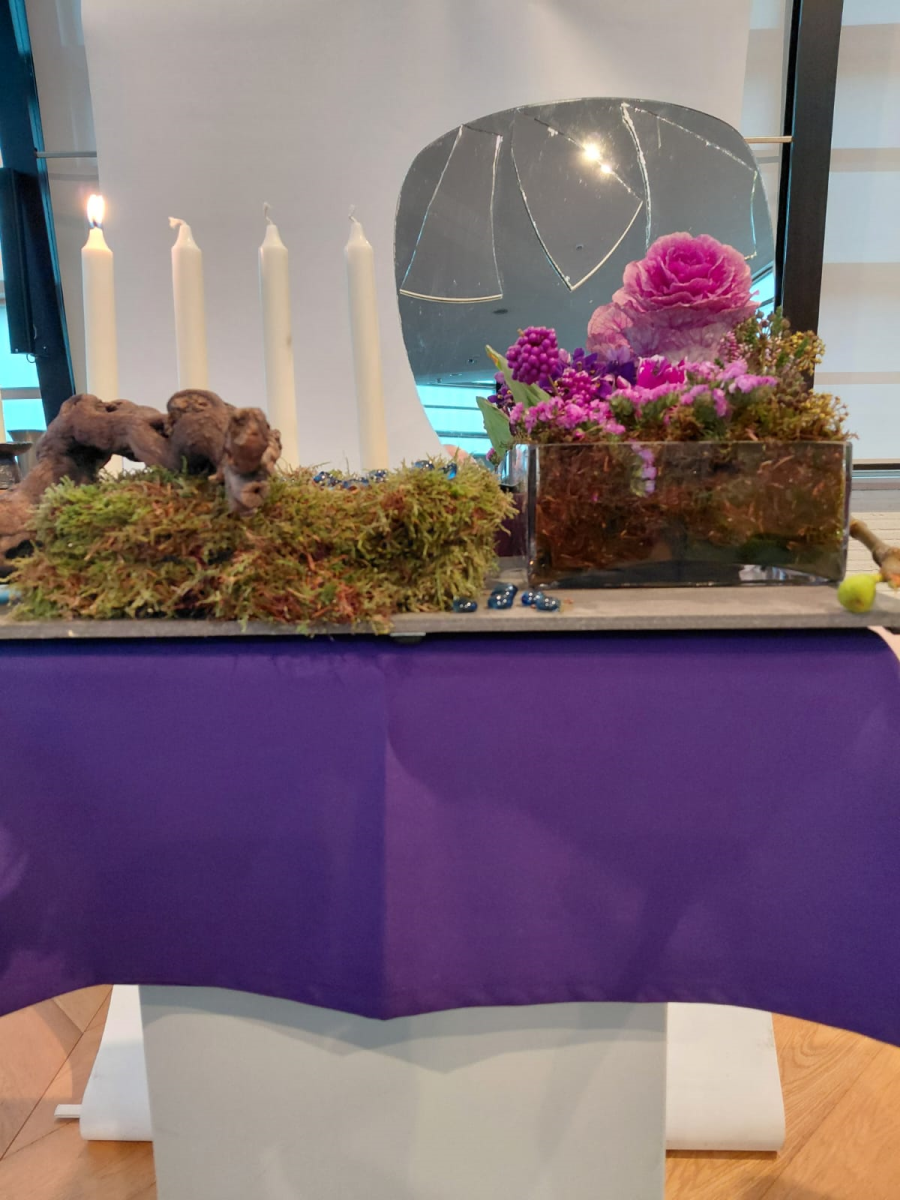 Liturgische bloemschikkingen tijdens Advent en Kerst 2025 In de weken van Advent en met Kerst maken Wilma en Wim van ’t Noordende weer prachtige liturgische bloemschikkingen. Hieronder treft u de beschijving aan en hier zijn meer foto’s te zien. 1e Advent Naar Jesaja 2 vers 1 – 5 Mattheus 24 vers 32 – 44 ‘Gods visioen van vrede en gerechtigheid’ is als volgt weergegeven We zien de omgekeerde wereld in de spiegel: Bovenaan symboliseren de glasscherven onze gebroken wereld, Onderaan is Gods wereld gesymboliseerd als een visioen van vrede en gerechtigheid. Als mensen alleen voor zichzelf leven is er geen bloei: Links voor is het kaal en dor geen bloemen of vrucht zoals ook in de dagen van Noach, de blauwe steentjes herinneren aan de zondvloed. Waar echter vrede en gerechtigheid wordt gedaan , komt de aarde in bloei en geeft vrucht. In de spiegel | ||